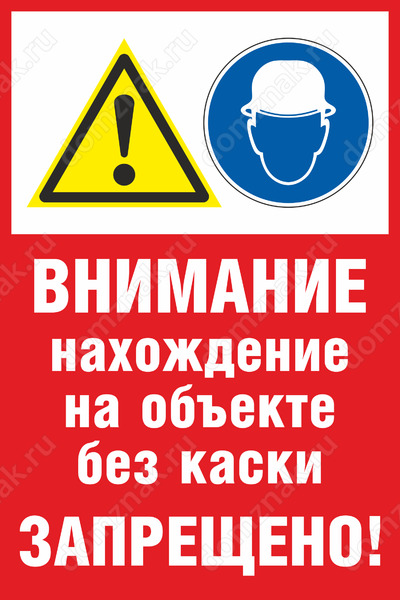 Табличка «Внимание! Нахождение на объекте без каски запрещено!» изготавливается на основе из пластика ПВХ или оцинкованного металла.