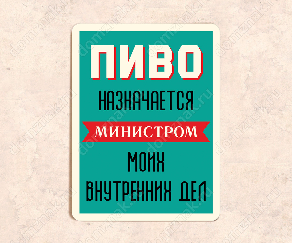 Табличка «Пиво назначается министром моим внутренних дел» изготовлена из пластика ПВХ, толщиной 4 мм. Изображение наносится по технологии УФ-печати. Табличка предназначена для использования как в помещении, так и на улице.