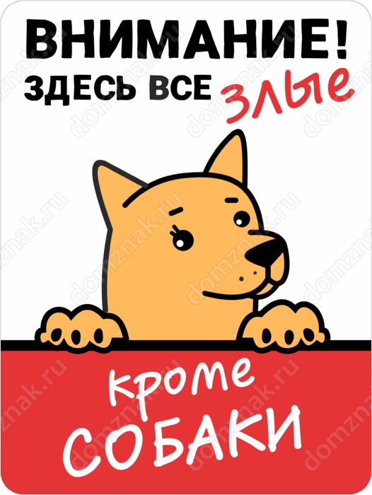 Табличка «Внимание! здесь все злые кроме собаки» изготовлена из пластика ПВХ, толщиной 4 мм. Изображение наносится по технологии УФ-печати. Табличка предназначена для использования как в помещении, так и на улице.